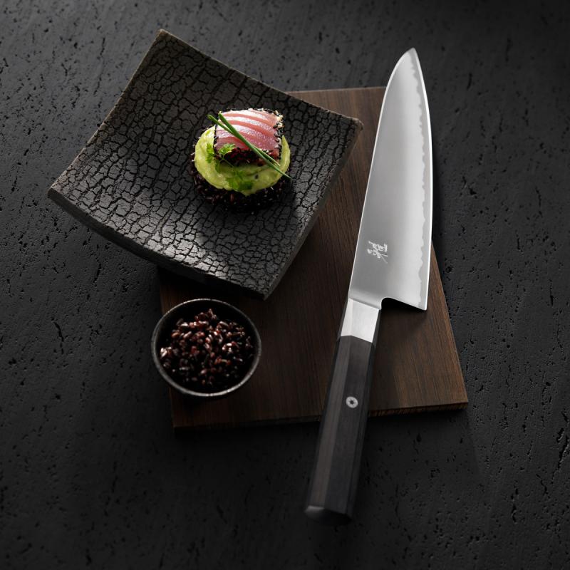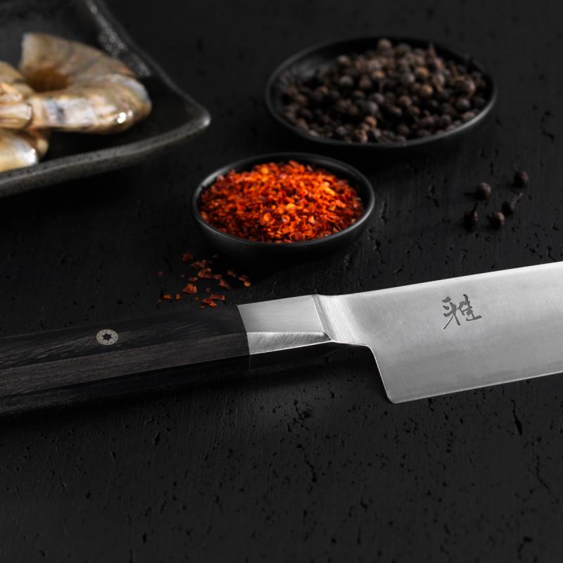 Ein prägendes Merkmal der Serie ist der achteckige Griff aus dunklem Pakkaholz. Er liegt angenehm und sicher in der Hand und unterstützt eine kontrollierte, natürliche Schneidbewegung. Die ausgewogene Balance zwischen Klinge und Griff sorgt dafür, dass auch längere Schneidarbeiten komfortabel bleiben.